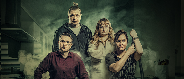 På bilden i pressmeddelandet föreställningen Kotijoukot. På bilden Joonas Nordman, Jarkko Pajunen, Emilia Sinisalo och Niina Lahtinen, foto Otto-Ville Väätäinen.